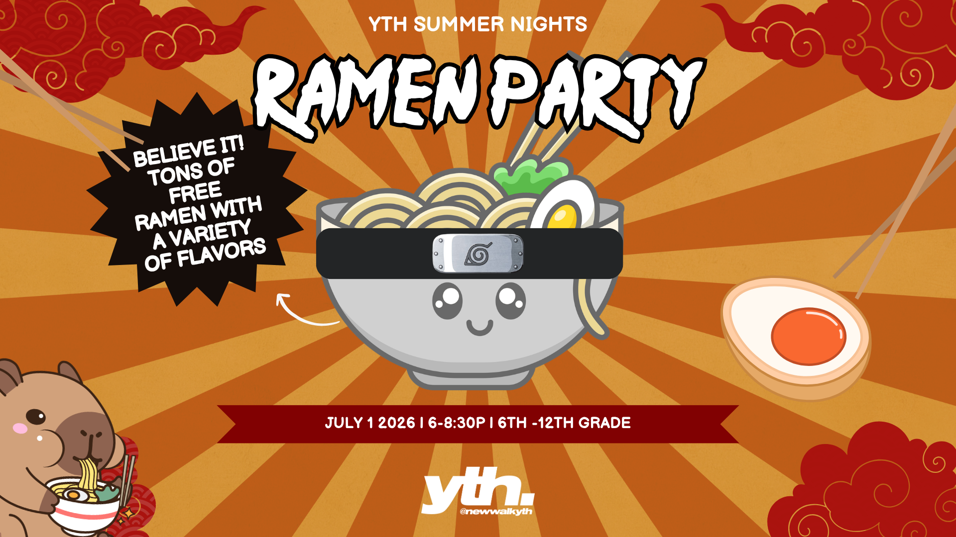 The Ultimate Ramen Party is Coming to YTH! 🍜 Get ready to channel your inner ninja! On July 1st, we are bringing the heat to Summer Nights with the first-ever YTH Ramen Party. If you're a fan of the classic comfort food (or just love a good Naruto vibe), this is one night you absolutely…